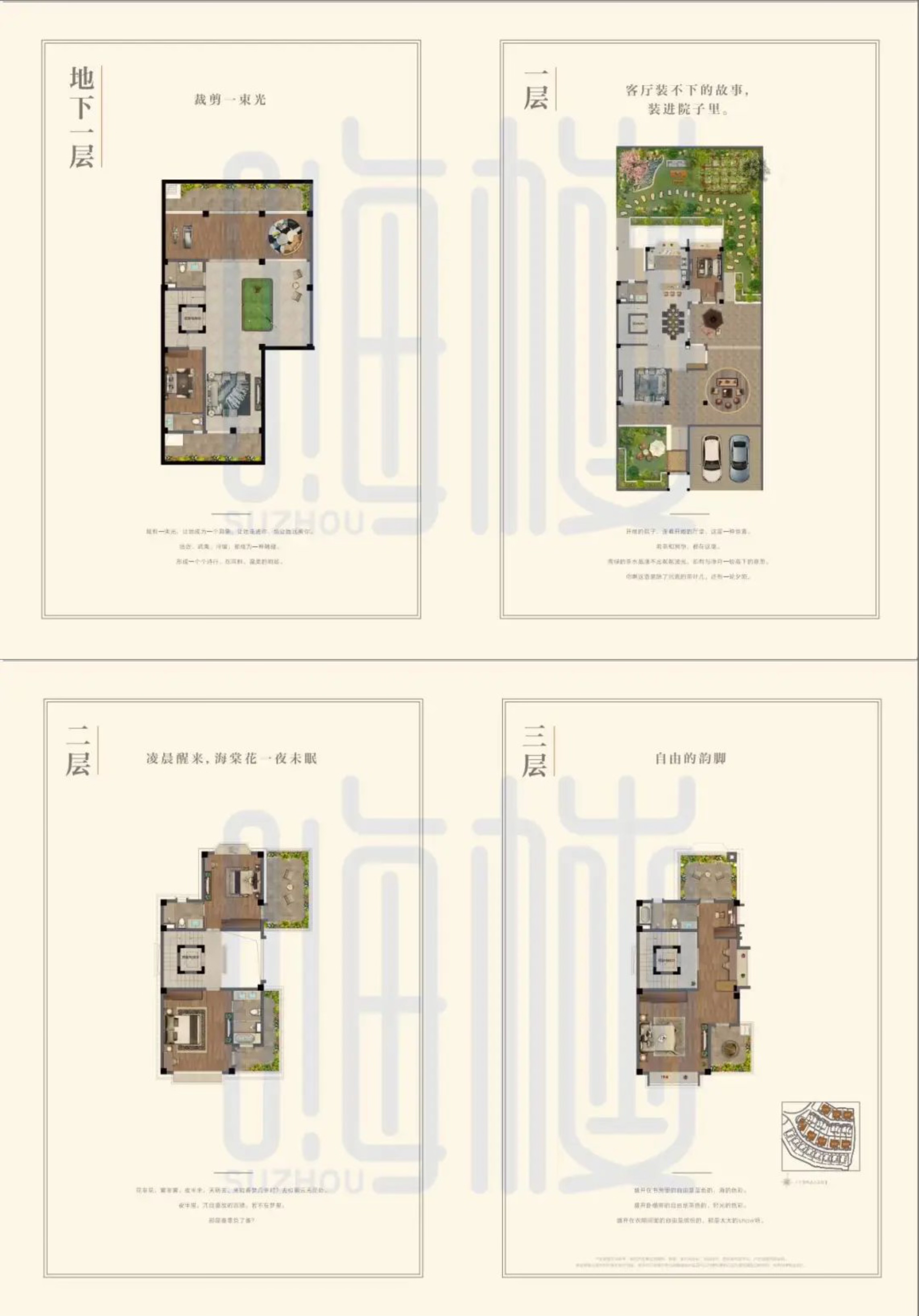独栋的负一楼:设有一个保姆房,其余为娱乐区域,其中有台球室、影音室、吧台和健身房等; 一楼:均采用南北双入户,带南北通透的连体超大花园;北向停车位,超大入户平台,为住户提供了更多的便利;独立观景餐厅设计; 二楼:独立的客厅、双套房; 三楼:547户型拥有一个豪华大套房,南北双露台。