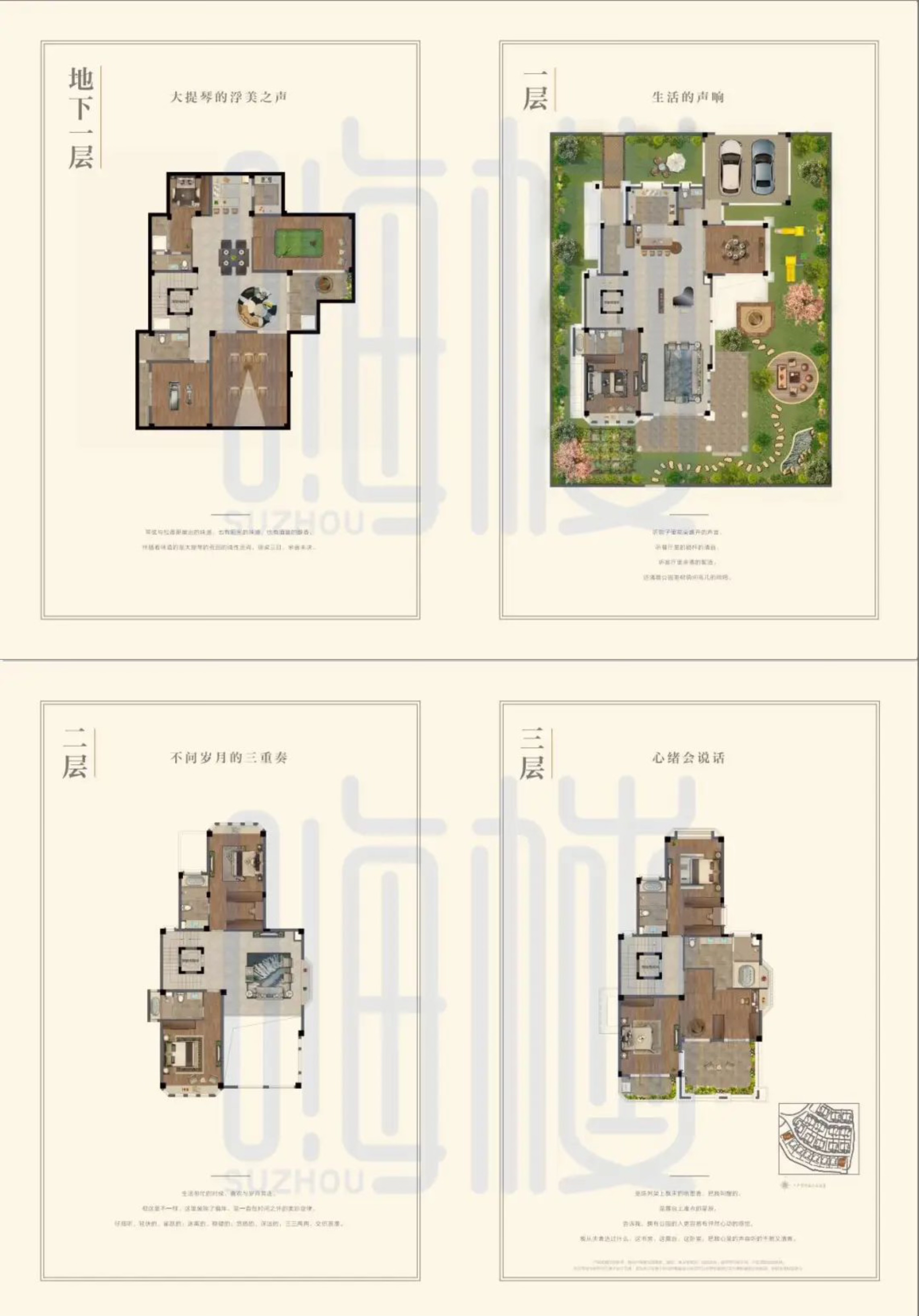 地下一楼:配有一个套房,其余为娱乐空间(台球和健身中心等); 一楼:南北双花园,北入户,北侧两个停车位,室内老人房、厨房、客厅; 二楼:带有2个卧室,北卧室连接北向超大露台,南卧室带有独立的阳台; 三楼:超级豪华的大套房,并配备小书房、南北两个露台。