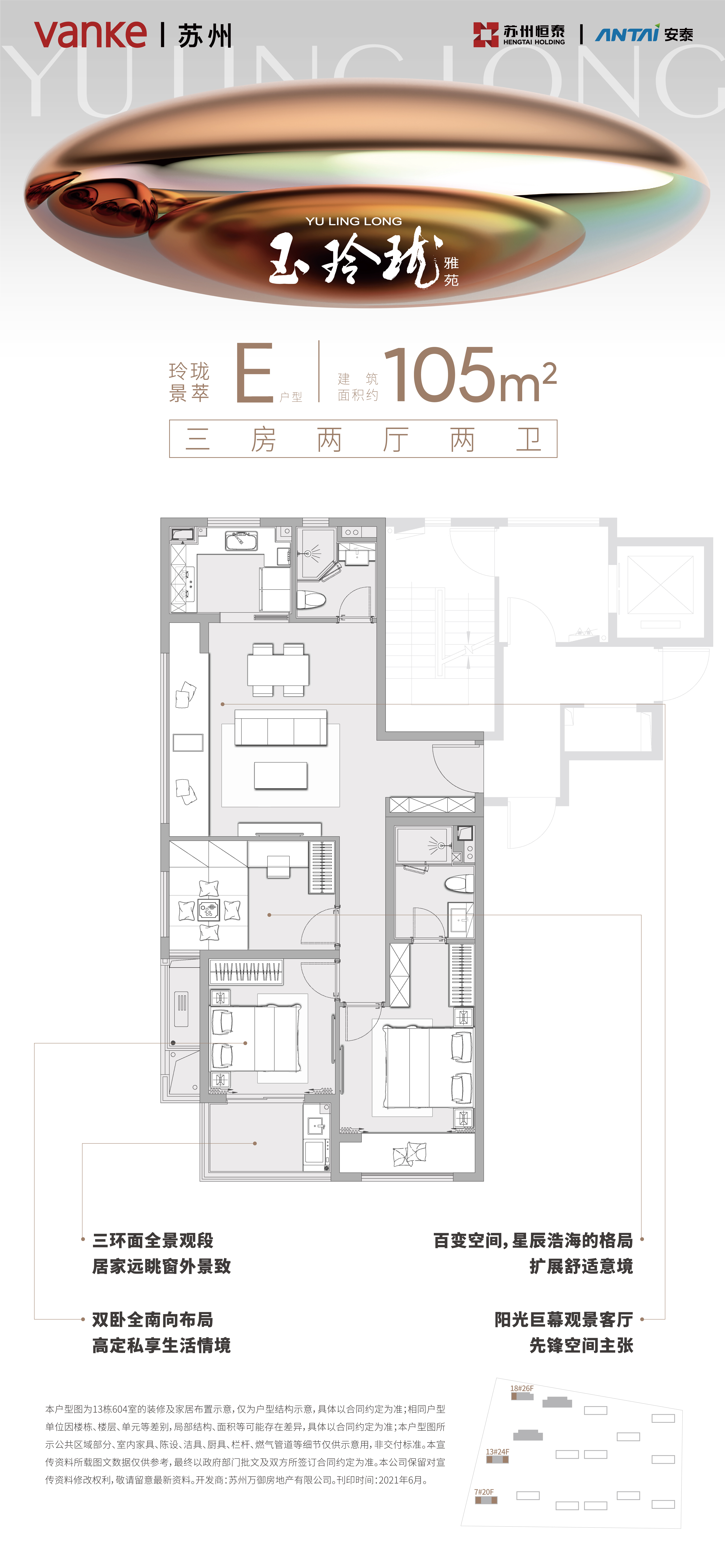 玉玲珑是万科在苏州的第4个玲珑产品,位于相城中央公园板块。项目首次植入CO.life生活概念,以“去售楼处化”为主旨,功能丰富,是未来邻里中心的缩影。 整个小区占地6.38万方,容积率2.5,绿化率 37%,由16栋16- -26层的小高层与高层组成,总户数1304户。目前在售的主力户型为103m的三房两卫,128m的三房两卫与165m的四房三卫三种户型。